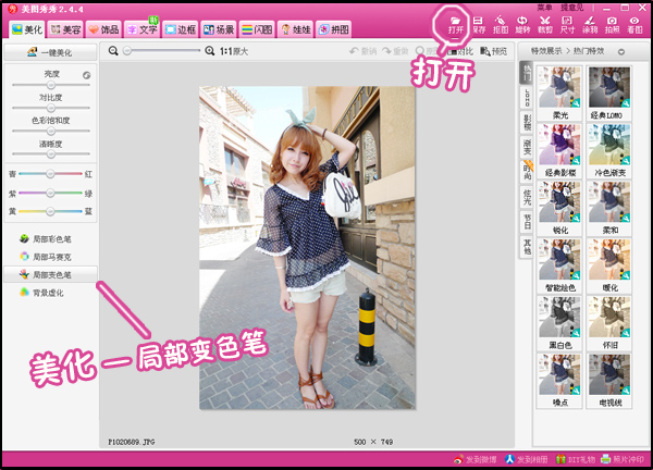 1、用“美图秀秀”打开一张照片,点击“美化”菜单下的“局部变色笔”功能。