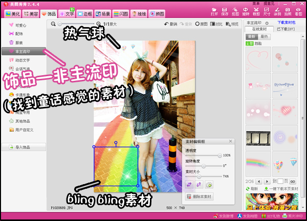 5、然后在“饰品”菜单下,给图片加一些有童话感觉的漂亮饰品,比如闪闪的素材,彩色热气球啊等等。