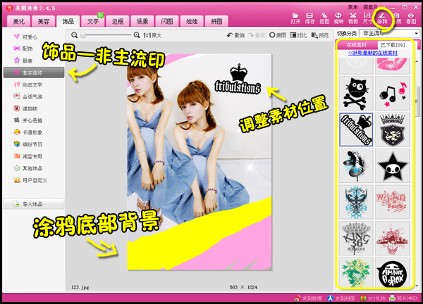 5、这时候用涂鸦功能,选用自己喜欢的颜色对图片底部进行简单的涂鸦,并在“饰品”菜单下,选择一些喜欢的饰品添加在图片上。