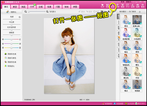 1、在“美图秀秀”软件下打开一张背景比较干净的自己照片,选择界面右上角的“抠图”功能。