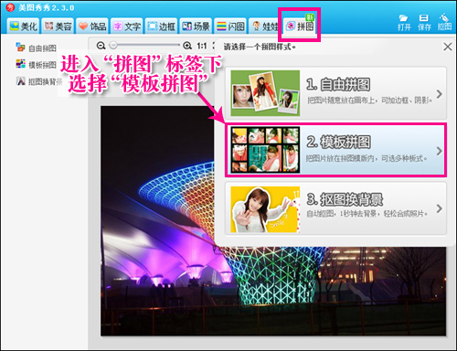 如图1的图片合成制作只需2步:先进入美图秀秀软件的“模板拼图”菜单。