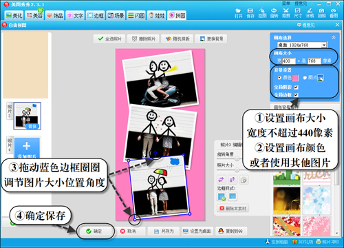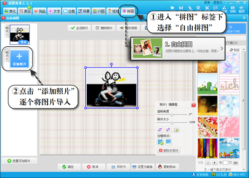 另外还有一种方法可以搞定图片合成,利用美图秀秀的“自由拼图”功能,将照片一起添加在一个画布中。