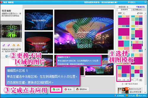 就拿最热门的世博游来说,同一个建筑在白天或不同灯光下呈现出多样的变化,这时候用利用简单的照片合成法,将多张照片拼起来对比一下,更能体现建筑的动态美。