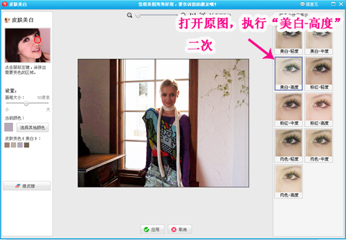 先打开要处理的背光照片,在美图秀秀的“美容”菜单中进行“皮肤美白”操作,让整体色调都亮起来。