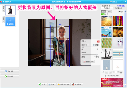 接着完成抠图,把背景替换为原图,将抠好的人物覆盖到原图人物位置上。