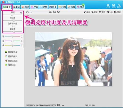 首先,在美图秀秀的“美化”菜单下进行亮度、对比度等细节参数调节。