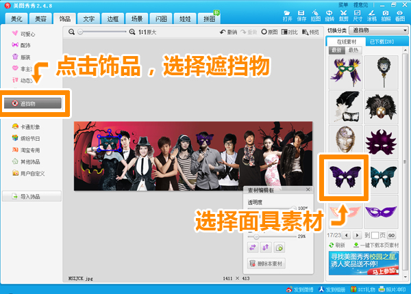 4、在将所有前景人物都排好之后,再到“饰品”——“遮挡物”标签下选取适合的面具素材,将人脸遮起来。