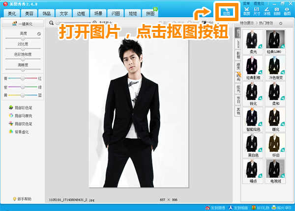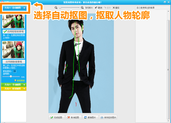 2、在抠图编辑框中,选用“自动抠图”功能抠出人物部分。