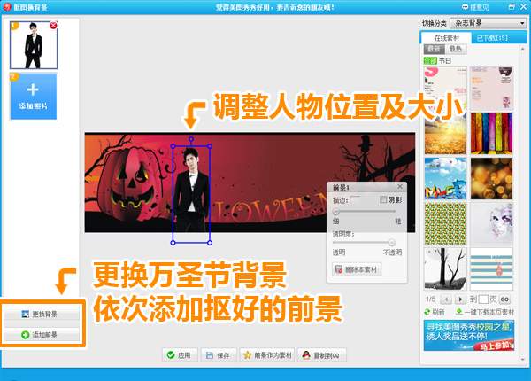 3、完成抠图后先更换为万圣节背景,调整人物前景的位置及大小,再依次添加抠好的人物前景。