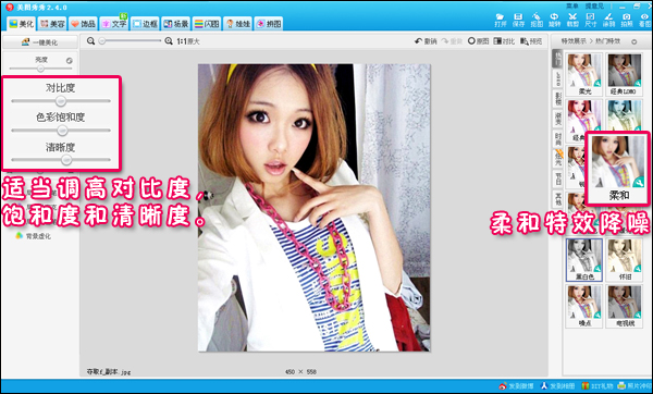 1、在软件中打开一张自拍照。原照的质量如果不是太好,可以在“美化”菜单下,适当调高照片的清晰度和色彩饱和度,并用“柔和”特效做些降噪处理。如图2所示。