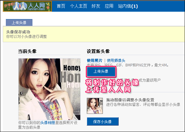 5、这就大功告成了,现在就将新做好的头像保存起来,然后上传到人人网吧。如图6所示。