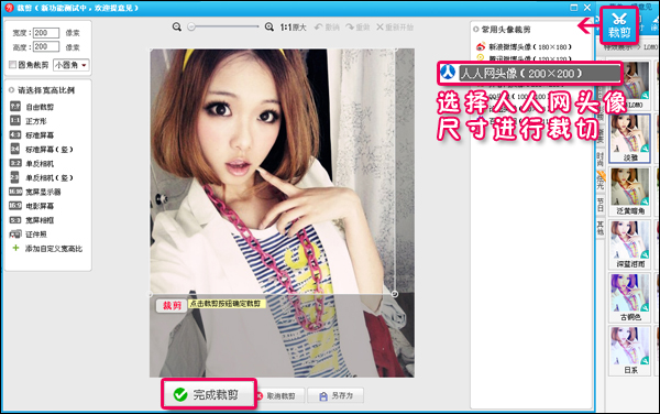 3、接下来这步很关键。当照片的尺寸与人人网上传规格不符时,上传后会显示不全或者变形。所以要对照片进行剪裁。而美图秀秀的裁剪功能里有常用的论坛、QQ、微博和人人网等头像尺寸。童鞋们只要选择对应的尺寸就能精确裁剪出人人网头像的图片啦。如图4所示。