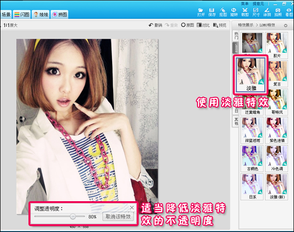 2、再对照片使用LOMO“淡雅”特效,并适当调整特效透明度,让照片色调变得更独特更时尚。如图3所示。当然,童鞋们也可根据自己的喜好添加其他的漂亮特效!