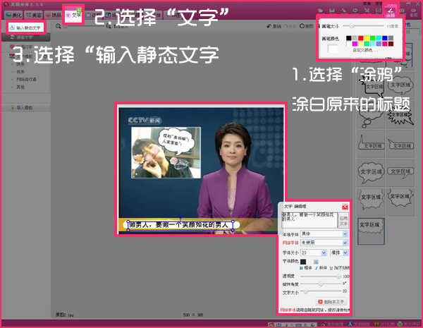 先选择“涂鸦”用白色的画笔将原来的新闻标题涂抹掉。在“文字”菜单下选择“输入静态文字”加上新的标题 。调整好字的颜色和大小后,这张照片就完成啦!