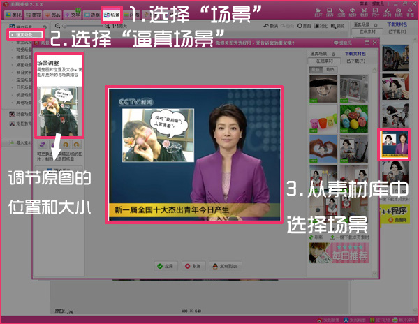 1、给已经加好饰品、漫画文字的照片加上场景。在“场景”菜单下,选择其中的“逼真场景”,从素材库中选择场景,这里示范选择的是新闻联播的场景。