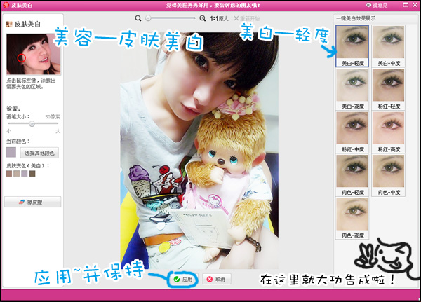 5、最后返回“美白”功能界面下,执行一键式“美白-轻度”,这样灰暗照片变亮彩的效果就大功告成啦!如图7所示。