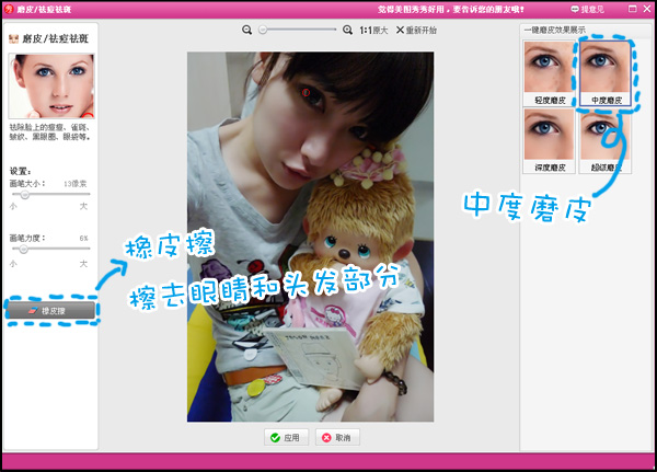2、在“磨皮祛痘”功能界面下,执行一键“中度磨皮”,就能去除噪点。再用“橡皮擦”功能擦眼睛和头发部分,保留细节的清晰,如图4所示。