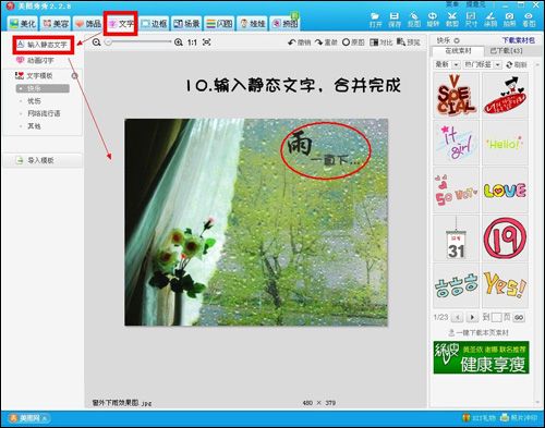 10、这样窗外的天气由晴天就变成了雨天,神奇吧?让图片增添了一些伤感的意境,这时再给图片加上一些心情文字(如图11所示),那就更棒啦!
