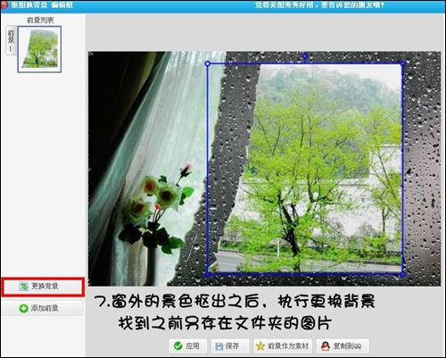 3、在编辑框左下角选择“更换背景”,把电脑中里的雨点玻璃图片作为背景,调整窗帘的大小位置,应用确定即可。