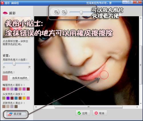 在给嘴唇上色时容易涂抹到外面,所以可以放大图片来处理,再利用橡皮擦擦除错误的部分,这样操作更方便。