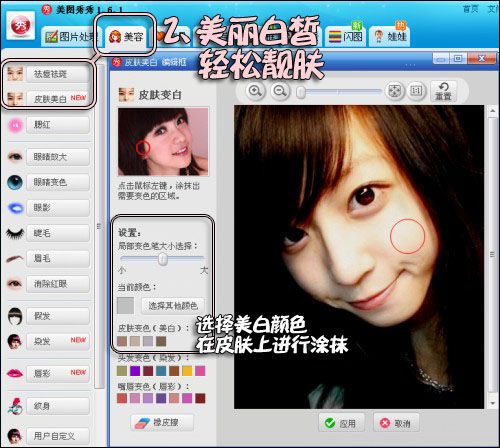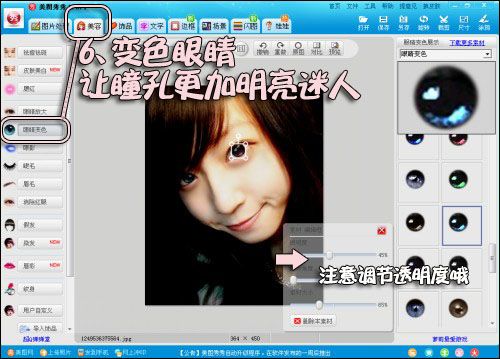 5、曝光解决,皮肤也变水水咯,接下来就是美容化妆啦,美图秀秀的“美容”素材里还可以使眼睛变色,而且很多颜色可以选哦。