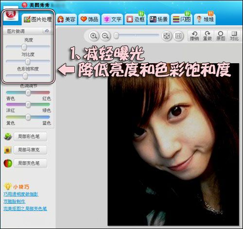 3、调暗了图片后,皮肤更加暗了。不过没关系,用美白功能把脸变白吧。