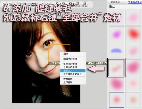 7、再添加睫毛和粉嫩的腮红。嘿嘿,不用化妆品也能轻松打造彩妆。记得添加素材后要合并哦。