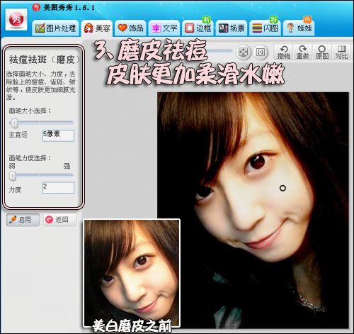 4、皮肤白了很多,不过美白之后皮肤的粗糙就很明显了,再用“磨皮”功能打磨一下。