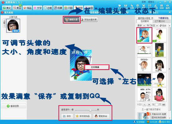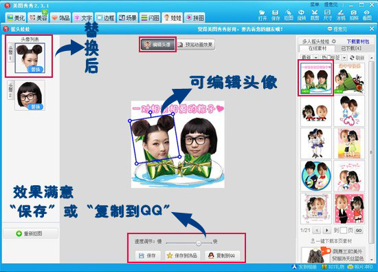 第三步:抠图完成后,会进入“摇头娃娃编辑框”,这时就可以选择喜欢的摇头娃娃素材,然后调整大小、角度,满意后可以先预览效果哦。如果OK的话,就可以保存啦,或者直接点击“复制到QQ”,聊天的时候特别方便。