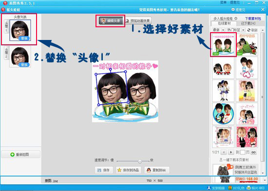 点击最上方的两个可爱粽子的素材就可以啦,在左侧编辑界面里替换一个头像。