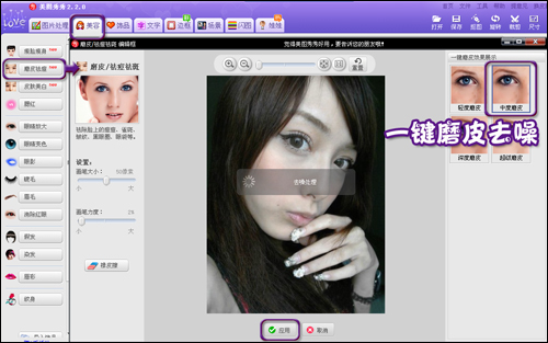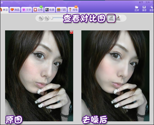 小贴士:根据照片噪点的多少可选择不同程度的一键磨皮功能,一般使用轻度或中度的磨皮去噪即可。去噪之后可以单击“对比”按钮查看处理前后对比图。