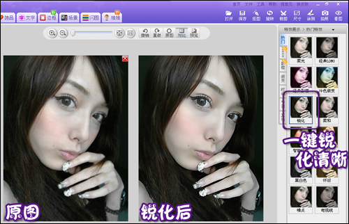 通常经过降噪处理后,会让原本就不清晰的手机照变得更加模糊。这时候对照片进行锐化处理就再适合不过了。使用“图片处理”标签下的“锐化”特效,一键即可提高自拍照的清晰度。