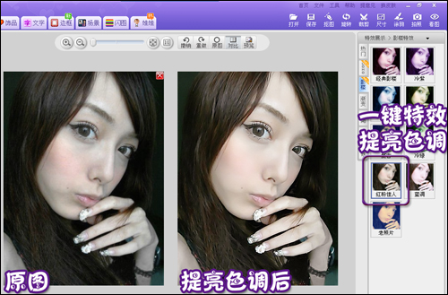 如果对一键特效处理后的照片不是太满意,还可以适当调节一下色彩饱和度和对比度,这对改善照片色调也有不同凡响的效果。