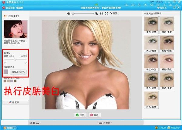 2、磨皮后,皮肤柔滑,但是色泽不均匀,所以要进行美白一下才更显肤质。进入“美容”菜单栏下的“皮肤美白”功能,为了照片的真实性,还是选择手动美白,调节画笔的大小选择适合的肤色对人物进行美白。