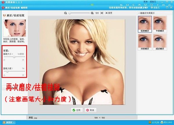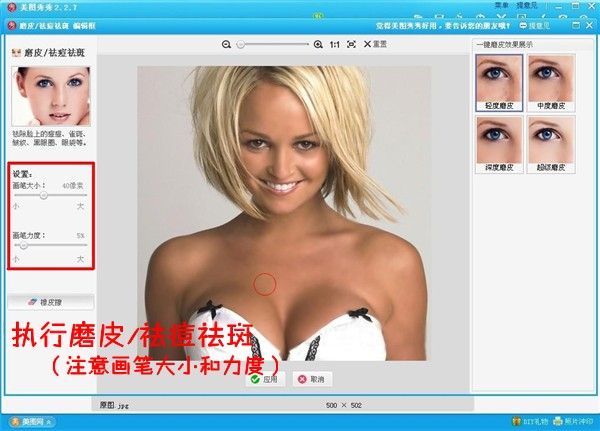 6、由于照片上还有些许瑕疵,所以再次执行“磨皮/祛痘祛斑”功能,这次利用局部磨皮/祛痘祛斑功能,设置好画笔大小和力度就可以轻松搞定了!