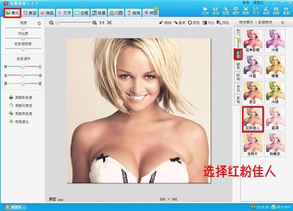 4、再来执行“影楼”菜单下的“粉红佳人”特效。由于执行淡雅后,图片较暗,于是这里选择红粉佳人效果提亮画面的中心部分,就会让照片色彩看起来更加自然。