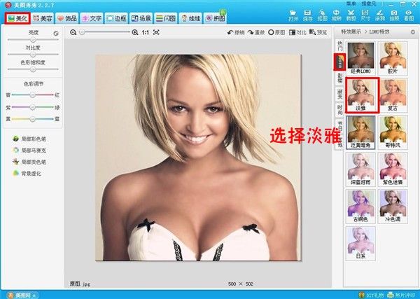 3、美白后执行“美化”菜单栏“LOMO”菜单下的“淡雅”特效。看如此个性的色调就这样一键敲定啦!