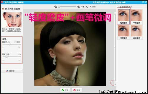 因为人物本身的皮肤不太好,为了最后效果更完美,可以先试试磨皮。在对人物皮肤进行磨皮处理时,不用过多的考虑皮肤的纹理和质感,稍磨过一些效果更好。这里我们之所以采用轻度磨皮再加画笔微调,而不是直接一键“超级磨皮”,是为了达到既使皮肤十分光滑又能很好的保持了头发的纹理。