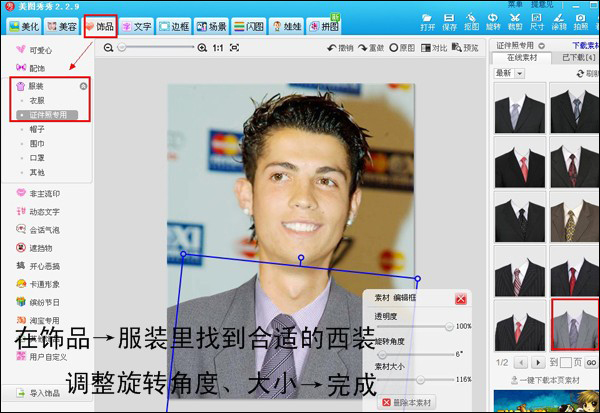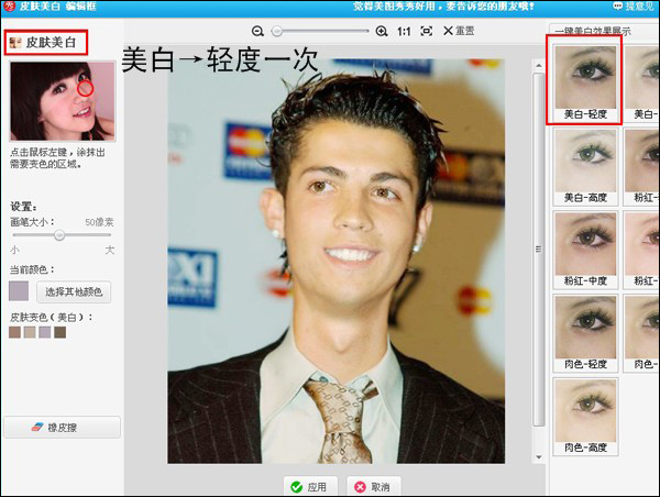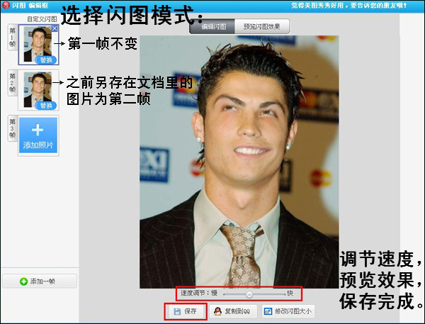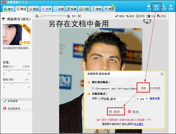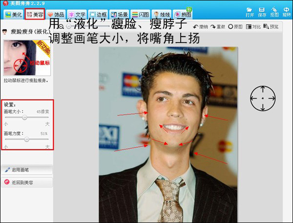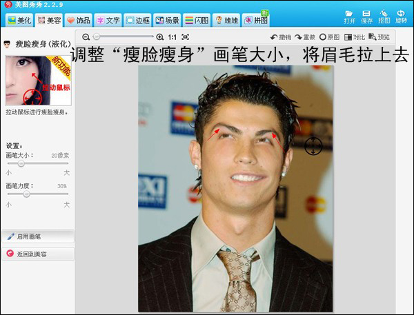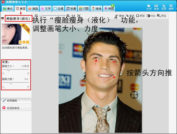 2010年南非世界杯大战在即,汇集了卡卡、C罗、梅西等11大足球巨星的超豪华阵容,引燃了全世界球迷的疯狂情绪。不过每个国家队的球星们都各有各的压力,尤其是C罗、德科领军的葡萄牙球队,身陷“死亡之组”。作为球队的死忠球迷,在为他们捏一把汗的同时,也想善意的恶搞一下喜欢的C罗,缓解压力,希望葡萄牙队能够顶住,成功出线,哦耶! 哈哈,小一号的瘦弱C罗是不是很可爱?用美图秀秀做起来也很简单哟。 图1瘦小嫩白版C罗 首先用美图秀秀打开C罗的照片后,进入“美容”菜单下的“瘦脸瘦身”功能,调整画笔大小和力度,朝着箭头所指的方向拖动鼠标。瘦脸、瘦脖子,拉嘴角都可以按照大家的想象去发挥。 然后把“整形”过的图片进行一次美白,让C罗显得更白嫩。 最后给他换上另外一套西服,在“饰品”——“服装”——“证件照专用”里选一套衣服换上就可以啦。记得调整饰品的角度和大小哦。 还有痞痞的正在挑眉的C罗,可以做动态表情哟! 像图6那样的效果用美图秀秀的瘦脸瘦身工具和闪图功能就简单搞定啦。 第一步:还是利用“瘦脸瘦身”功能,把人物的脸部表情改变,往希望的方向推动即可。这里主要是把眼睛往上推,以及嘴巴向外拉,制造出眯眼、撇嘴的痞痞的效果。 第二步:将上一步做好的改动完的图片先保存起来,备用。 第三步:在第一步修改好的图片基础上,再用“瘦脸瘦身”工具把C罗的眉毛拉上去,制造出一些细节的变化。 第四步:点击“闪图”菜单下的“自己做闪图”功能,在编辑框里添加第二步保存的那张图片,再预览一下效果,就能看到有趣的挑眉动作啦。记得最后要保存哦! 再上一个类似效果: 嘿嘿,创意恶搞的方法有很多,大家发挥想象力肯定会有更多不同的大作出炉,到时候可别忘了跟大家分享哦!最后,希望广大C罗球迷们不要拍我,支持C罗,支持世界杯!