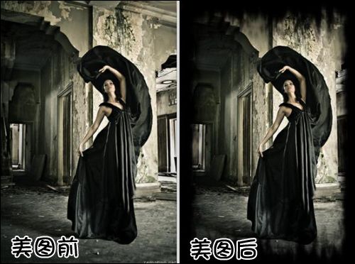 3.再来点复杂点的。“撕边边框”默认的颜色是白色,但在左侧的“色彩库”里可以调整边框的不同颜色。对于暗色调的图来说,使用白色会起到很大的冲突,很不合适,而选择相应的黑色调就很自然的融图成功,相对于原图,这样更具有“哥特”风格!