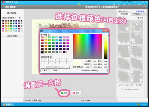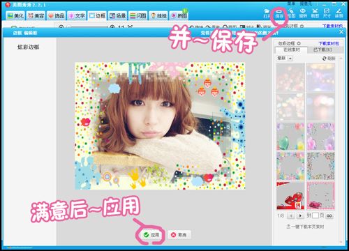 这期YUMMY要来创意一把,教大家通过边框的叠加操作,制作出各种美美效果哟!不多说了,我们赶快开始吧。 照例先来看效果图: 感觉这样边框叠加的效果,好像以前在大头贴机拍的大头贴哦!呵~~是不是很Q呀?现在YUMMY就来给大家介绍一下我用美图秀秀制作的简单步骤吧! 点击下载美图秀秀:/SoftView/SoftView_19615.html 1、进入美图秀秀软件界面,打开一张原图并进入“边框”菜单栏的“撕边边框”功能项,选择个人偏好的边框素材,YUMMY选择的,亲们可以看看下图的图示。 2、要注意咯!美图秀秀的撕边边框是可以自定义颜色的,边框应用好后,YUMMY就给选择的撕边边框改变了一个淡淡的黄色。 3、完成以上的步骤后,就到了另一款边框叠加的步骤了,同样是“边框”菜单栏下的,但是YUMMY选择的是“炫彩边框”叠加,如下图示。 4、在“炫彩边框”的编辑框中(如下图所示)选择并预览,效果满意后,点击应用并保存,很Q很像大头贴一样的照片就搞定啦! 以上是YUMMY做的可爱版效果,再给亲们看看同样是使用了边框叠加功能的公主版效果: 各位亲们看完以上YUMMY制作的美美效果后,是不是心痒痒呀!那就赶快去下载美图秀秀做个专属你的美美效果吧!本期边框叠加的教程就结束了,下期更精彩,亲们要继续关注哦!