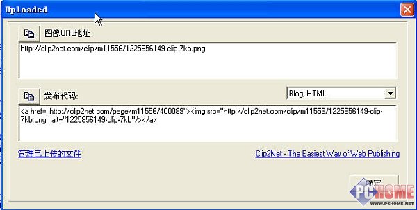 如果想上传至网络存储空间,直接点击“发布”按钮就可,如果有需要,可以设置其他参数,如文件夹、注释、是否加密、保存服务器时间等等。上传后Clip2Net将反馈图片URL地址,以及直接可应用于页面、Blog、论坛等地方的代码(图2)。代码和地址都可以直接点击“复制”按钮进行快速复制。
