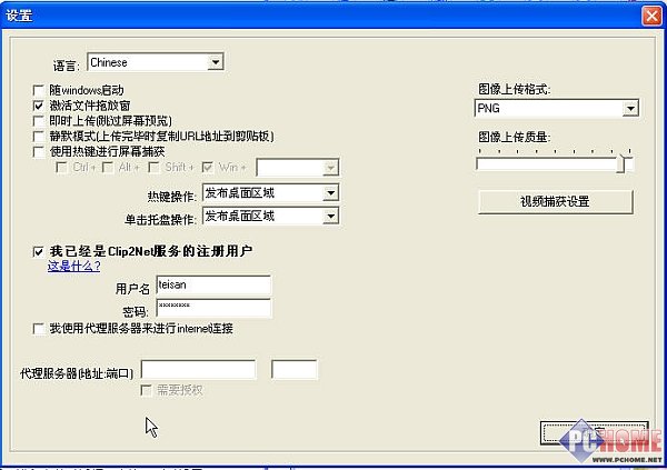 参数设置(图3):打开系统栏软件图标的右键菜单,点击“设置”进入参数对话框。在这儿可以设置图像质量、视频捕获、是否即时上传、开启热键截屏、自动复制图片URL地址等等。 图3:参数设置 虽然Clip2Net单体的截图功能并不强大,但足以应付目前普通的应用。最重要的是它将网络元素整合起来,可以更好的为网民服务应用,不管是Blog用图,还是编辑页面,亦或时论坛发帖。Clip2Net 参数设置