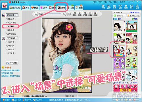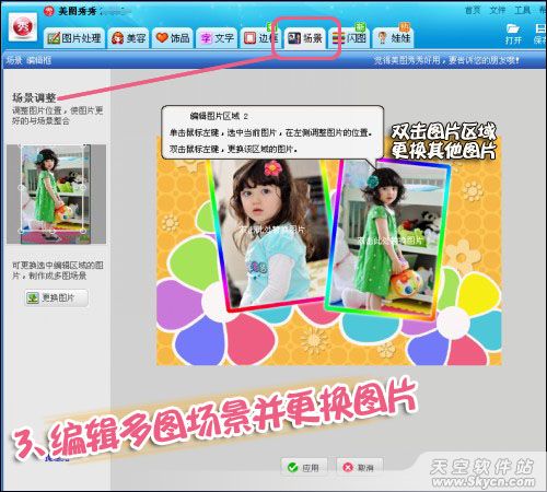 第二步:进入“场景”标签下,为了让宝宝的照片更加可爱,我们还可以用多图场景,将宝宝的照片集合在一张图片上。