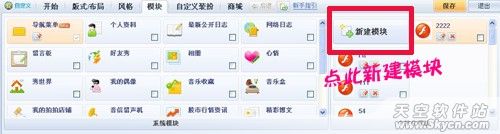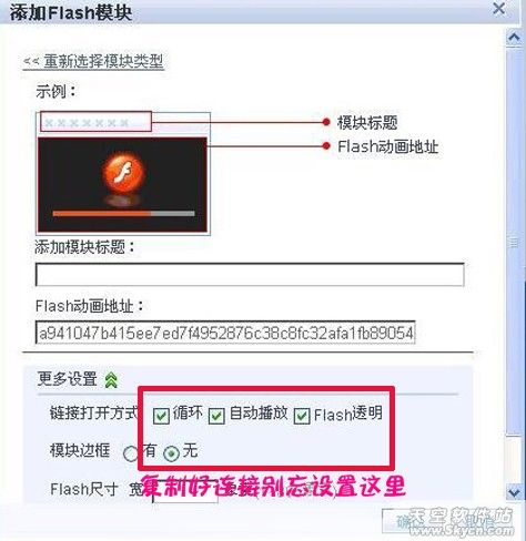 图7点击空间右上角“自定义”,然后选择模块里的“新建模快”,选择第3个“FLASH模块”,把复制的连接粘贴进去,循环、FLASH透明全部打勾、边框无,设置好后确认。