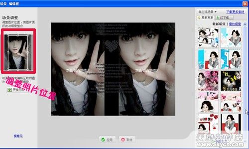 图3 在场景编辑框左边我们可以用鼠标调整照片的位置。确认后点应用,这样我们就做好了装饰空间的模块,保存好图片继续下一步。