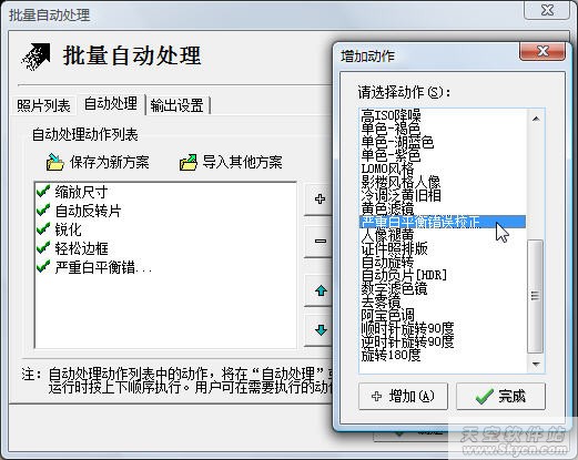 如果我们要修复的照片太多,则可以使用批量处理功能。选择“文件”→“批处理”命令,可以打开如图5所示的窗口。我们单击“目录”按钮,然后选择欲转换的图片所在文件夹,即可将其中的图片添加到转换列表中。单击“自动处理”标签,在其中我们可以添加/设置特殊的修复效果(如图5,比如“严重白平衡错误校正”),也可以单击右侧的相应按钮,在打开窗口中设置好相应修复效果的参数值。
