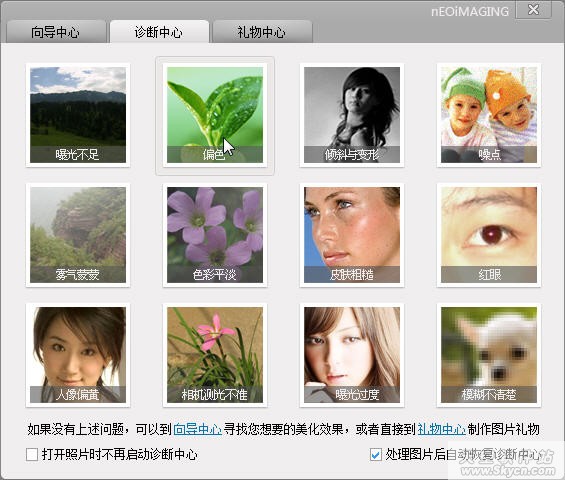 新版的光影魔术手提供了一个“诊断中心”的功能(如图2),已将常见的照片修复功能罗列其中,方便操作。我们只要单击相应的修复功能,再打开照片操作即可(如图3),完成后会返回到向导窗口继续操作。