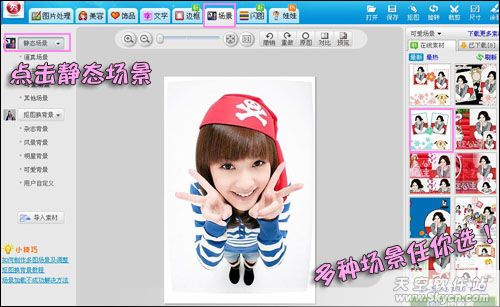 启动美图秀秀,打开场景标签下的静态场景功能,选择一个你喜欢的场景,要选择多图的哦。