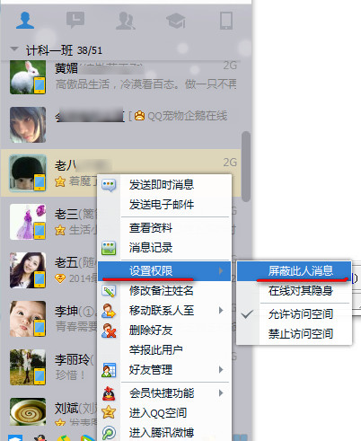 首先我们登录QQ,进入好友列表。选择你想要暂时屏蔽的好友,右击“设置权限”,然后点击“屏蔽此人消息”。